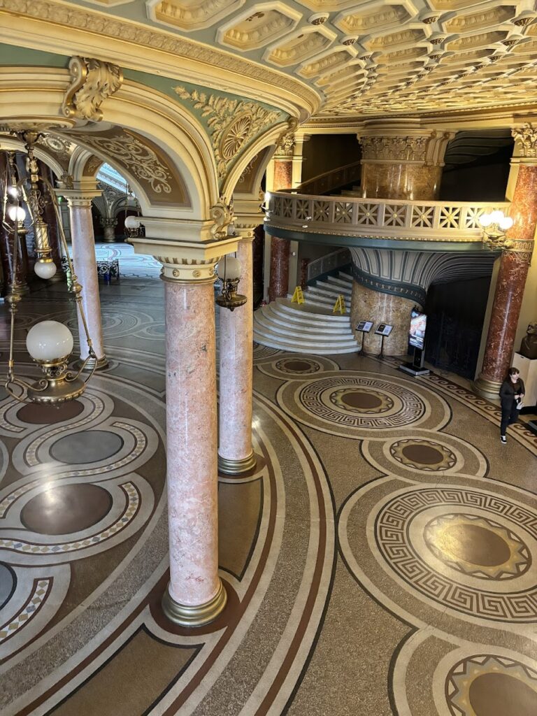 E poi c’è lui: il grande affresco che corre lungo il fregio sopra i palchi. È opera di Costin Petrescu e racconta la storia della Romania tramite 25 scene. Le fonti ufficiali della Filarmonica lo descrivono come un affresco di 75 m² e “largo 3 metri” (cioè con una fascia importante, che ti avvolge mentre guardi in su).
