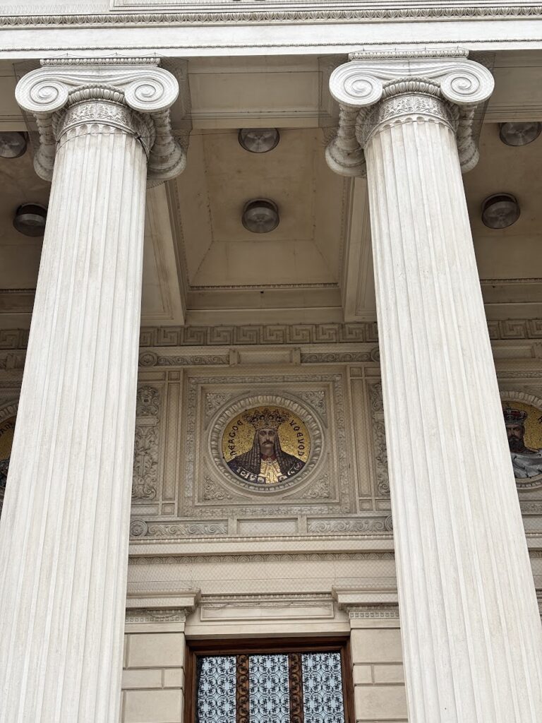 Prima ancora di entrare, vale la pena fermarsi qualche minuto davanti alla facciata neoclassica dell’Ateneo, con il suo colonnato e il frontone decorato che fanno subito “tempio della cultura”. Davanti all’edificio c’è una piccola piazza-giardino con aiuole e la statua del poeta Mihai Eminescu: è uno di quei posti dove ti viene spontaneo tirare fuori il telefono e scattare una foto prima di continuare la visita.