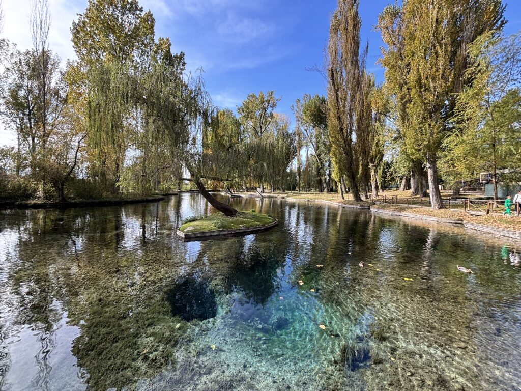 Ci siamo arrivati domenica 19 ottobre 2025, in tarda mattinata, tornando da un giro in camper che aveva messo insieme Nocera Umbra, Rasiglia e Sellano. La scelta perfetta per chiudere il viaggio: un parco curato, pieno di verde, acqua che sembra finta da quanto è limpida, e un’atmosfera che mette d’accordo bambini e adulti.