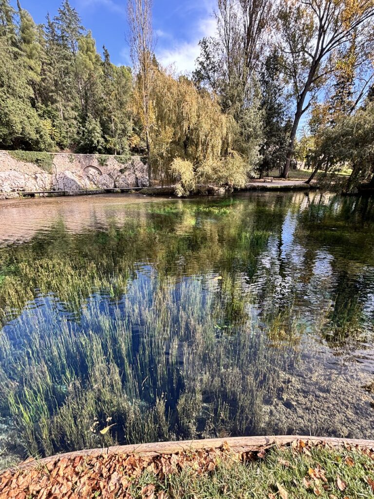 Il parco delle Fonti è legato al fiume Clitunno, un fiume di risorgiva: in pratica nasce da sorgenti alimentate da percorsi sotterranei e poi forma il celebre laghetto dentro al parco.