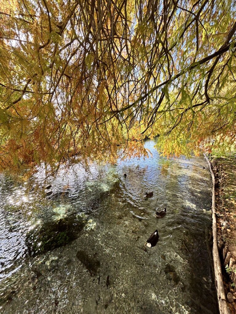 Noi abbiamo notato in particolare un salice davvero bellissimo (e, spoiler: il salice in un posto del genere fa sempre la sua figura, anche solo per sedersi due minuti e guardare l’acqua). Sul sito ufficiale viene spiegato anche che nel laghetto e sulle rive ci sono tantissime specie vegetali e si citano piante acquatiche e alberi caratteristici, inclusi i salici piangenti e il pioppo cipressino.